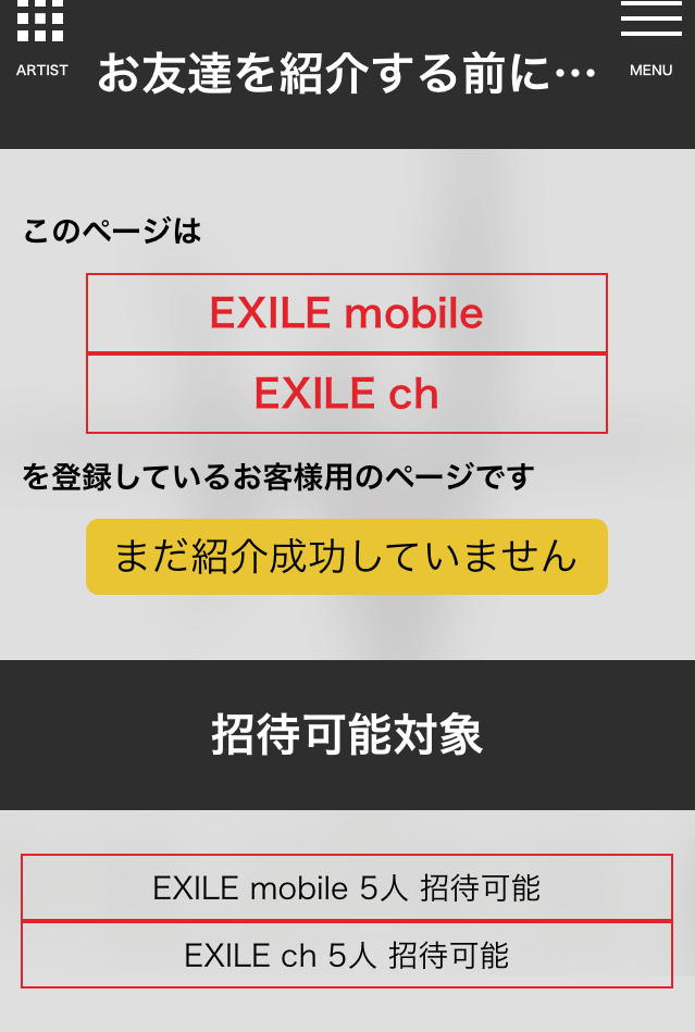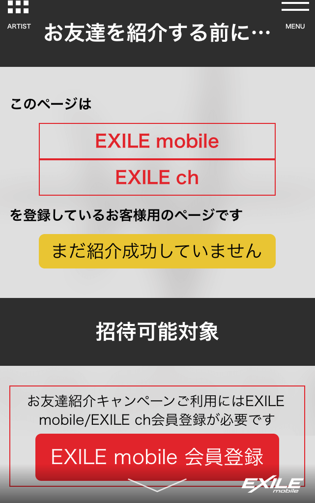 「友達紹介」は、「EXILE mobile/EXILE TRIBE mobile/LDH mobile/LDH Girls mobile/EXILE ch」の5サイトいずれかを友達に紹介して、友達が入会すると友達が入会した人数に応じて抽選ができるキャンペーンです。友達をいっぱい紹介してステッカーをGETしよう!!