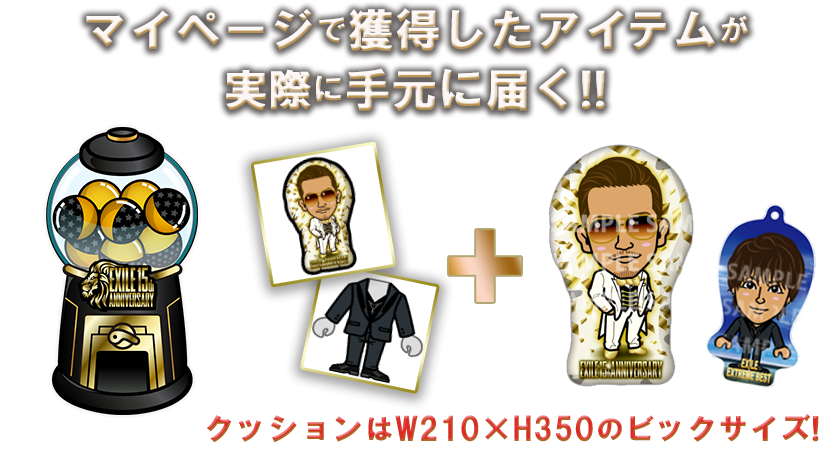 ※もらえるクリーナー・クッションのメンバーはアイテムをGETした際の「15周年クッション EXILE HIRO」等アイテム名の後ろに記載しているメンバーとなります。