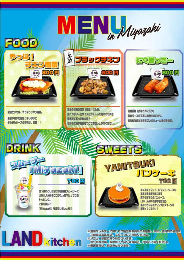 LDH LAND in Miyazakiにて出店するLAND kitchenのオリジナルメニューは、宮崎がギュッと詰まったメニューとなっていますので、ぜひ食べて飲んで“宮崎”をフルに感じてください!