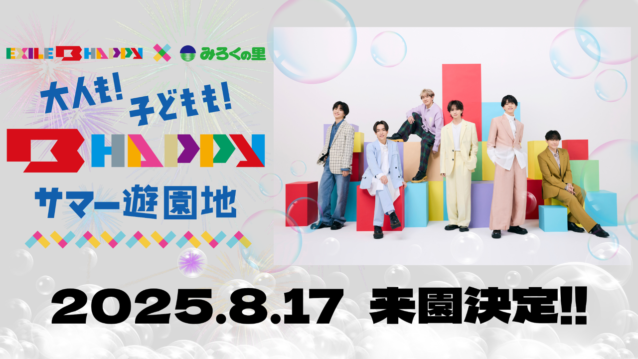 8/17(日)に広島県内No.1スケールを誇る遊園地"みろくの里"にて、『EXILE B HAPPY × みろくの里「大人も子どももB HAPPY サマー遊園地!」』の開催が決定しました!