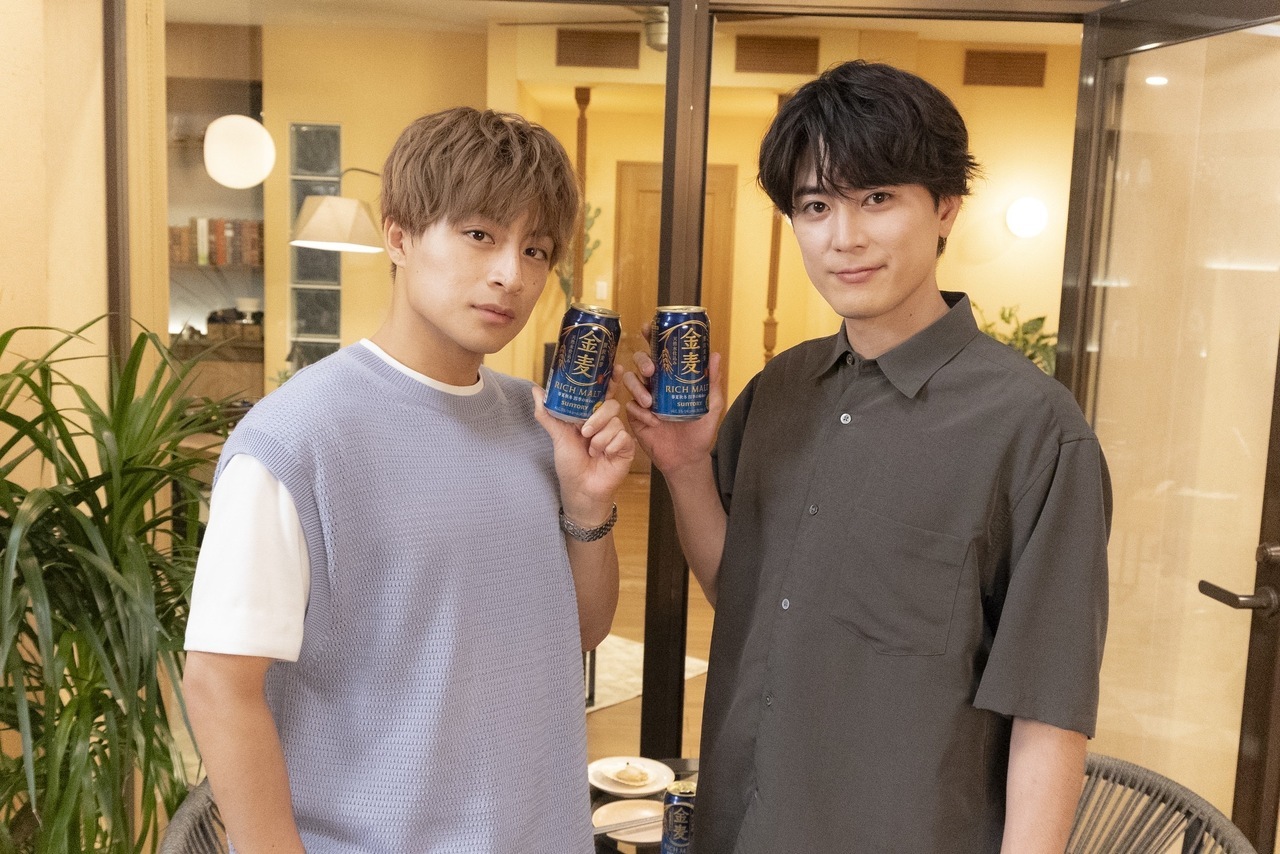 間宮祥太朗さん演じる水島健人と白濱亜嵐演じる山内守が、ドラマ本編でおなじみの健人の別荘のテラスで炭火焼を楽しみ、新鮮な地のものと「金麦」で楽しむ晩酌が、明日への英気を養い、楽しいひと時を過ごすというストーリーが描かれています!