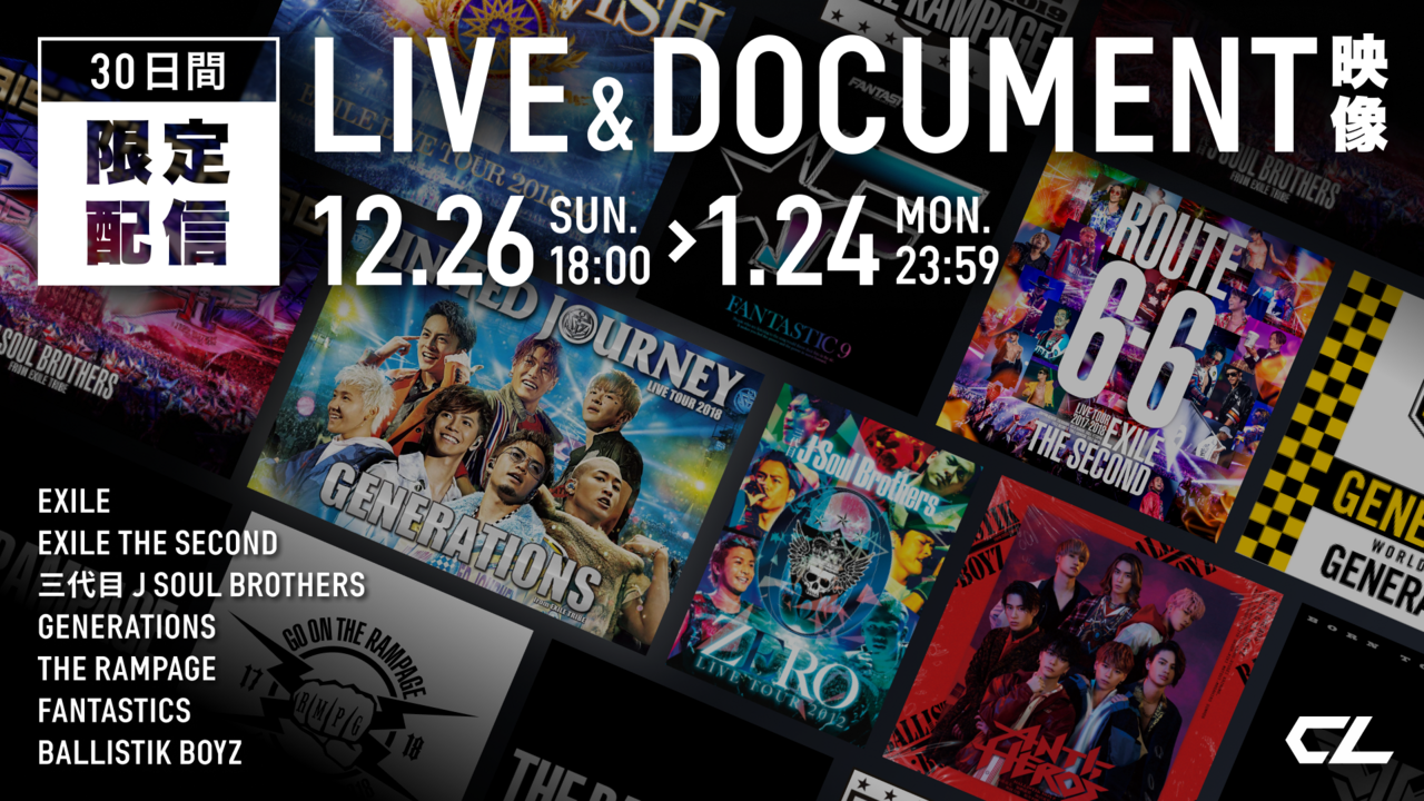 本日、CLにて12/26(日)18:00よりEXILE TRIBE各グループのライブ・ドキュメンタリー映像作品を期間限定で公開します。