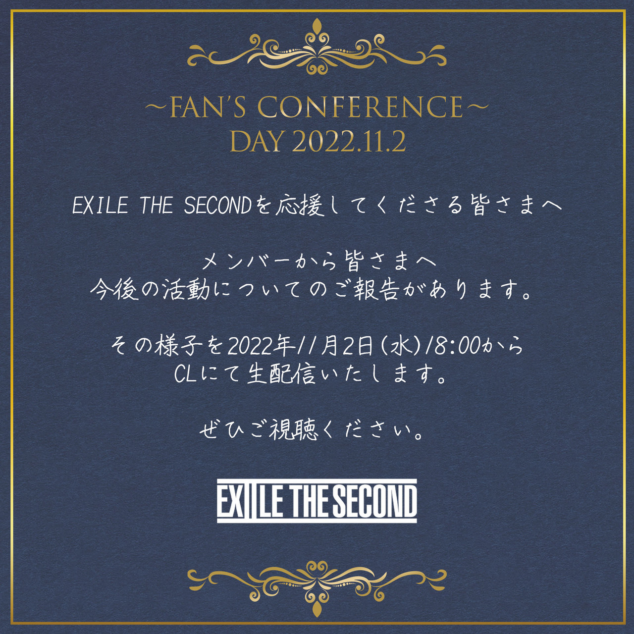 EXILE THE SECOND 2022.10.21 2022.11.2(wed)18:00〜 EXILE THE SECOND FAN’S CONFERENCE配信 いつもEXILE THE SECONDを応援いただき、ありがとうございます。 EXILE THE SECONDを応援してくださる皆さまへ メンバーから今後の活動についてのご報告があります。 その様子を2022年11月2日(水)18:00からCLにて生配信いたします。 ぜひご覧ください。