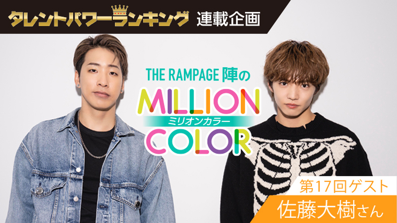 佐藤大樹 2022.11.01 陣連載 タレントパワーランキング『THE RAMPAGE陣のミリオンカラー』Vol.17に佐藤大樹が登場! タレントパワーランキングにて、陣による『THE RAMPAGE陣のミリオンカラー』Vol.17が更新されました! この連載は、THE RAMPAGEのパフォーマー兼グループのリーダーでもある陣が、様々な分野で活躍する方との対談で、自身もエンターテイナーとして成長していく連載企画です。 Vol.17のゲストは佐藤大樹が登場! お楽しみに! ▼記事はこちら https://tpranking.com/zin-millioncolor-17