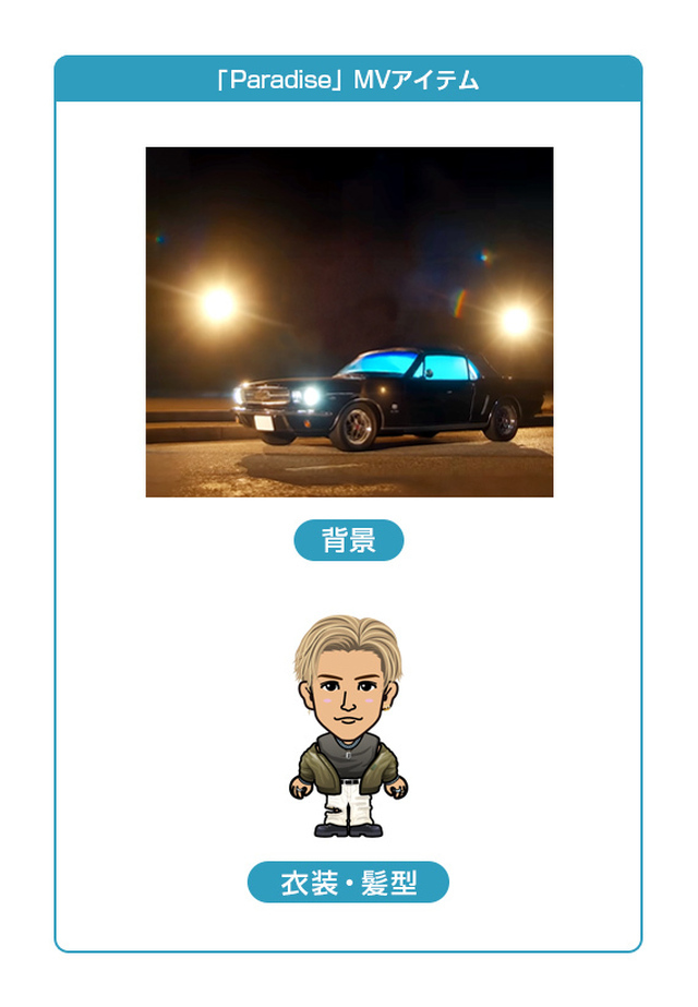 EXILE mobile マイページ 岩田剛典 2024.03.26 【EXILE mobileマイページ】岩田剛典「Paradise」MVアイテム配信!! EXILE mobileマイページでは、 岩田剛典「Paradise」のMV公開を記念して、 MVアイテムを配信します!! 是非MVアイテムをGETして、着せ替えを楽しみましょう! ※「Paradise」MVアイテムは岩田剛典のアバターのみ着用可能です。 ※岩田剛典【A】【B】【C】のアバターは、「Paradise」MV髪型を着用することができません。 ※コブラのアバターは、「Paradise」MV髪型を着用することができません。
