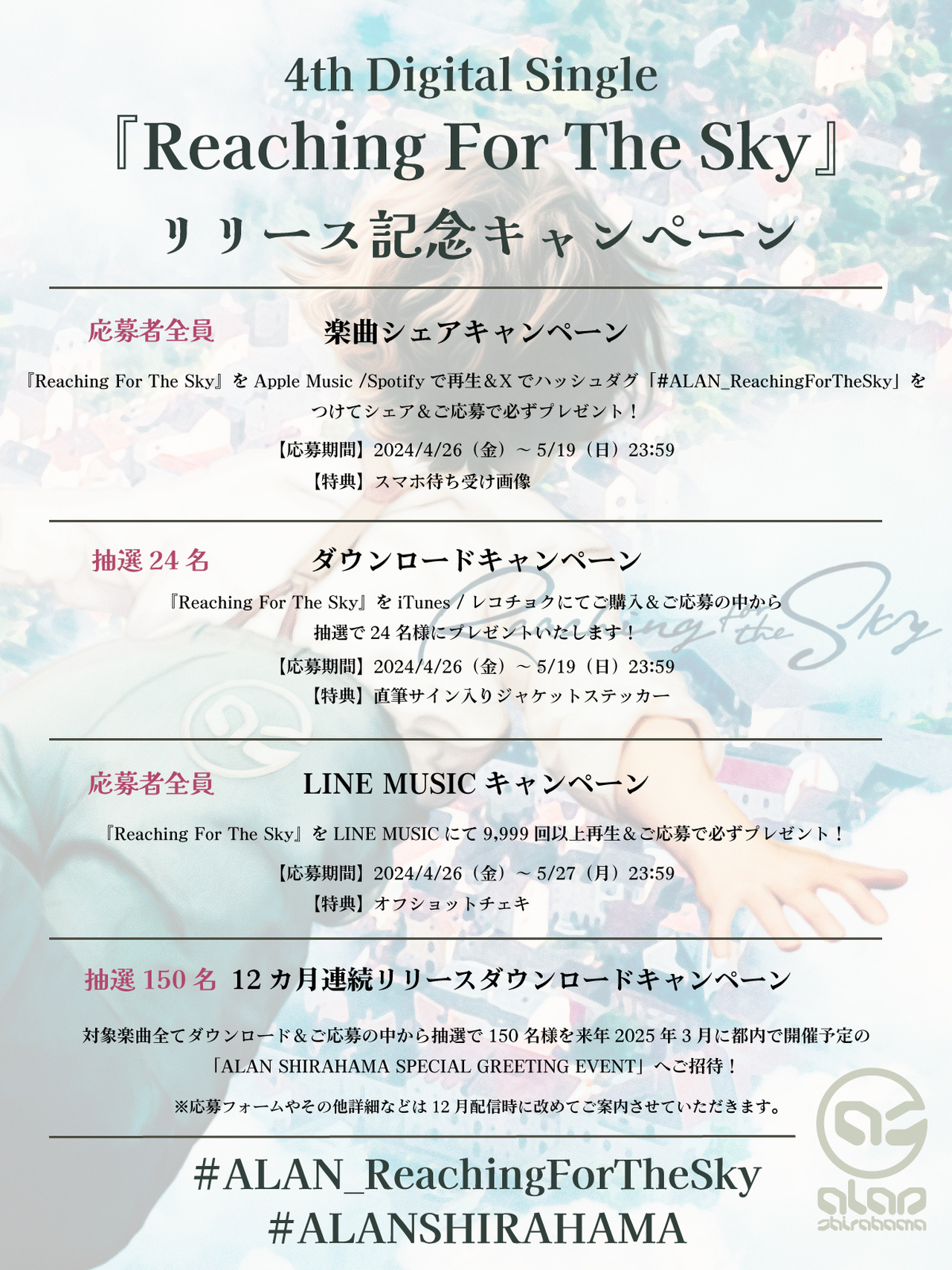 白濱亜嵐 2024.04.24 ALAN SHIRAHAMA 4th Digital Single『Reaching For The Sky』リリース記念キャンペーン実施決定! 4/26(金)配信開始の4th Digital Single『Reaching For The Sky』のリリースを記念して、キャンペーンの実施が決定しました! 各キャンペーン詳細と注意事項をよくお読みになり、ご応募ください! Apple Music / Spotify 楽曲シェアキャンペーン iTunes/レコチョク ダウンロードキャンペーン LINE MUSIC 再生回数キャンペーン 12ヶ月連続リリース ダウンロードキャンペーン 【お問い合わせ先】 contact@ldhrecords.jp 平日10:00〜18:00(祝祭日を除く) ※配信サイトへの本企画のお問い合わせはご遠慮ください。