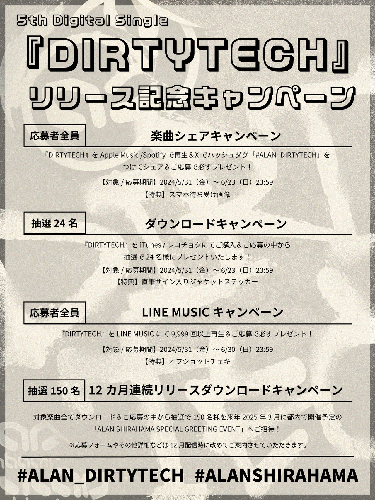 5/31(金)配信開始のALAN SHIRAHAMA 5th Digital Single『DIRTYTECH』のリリースを記念して、各サービスでのキャンペーン実施が決定しました!