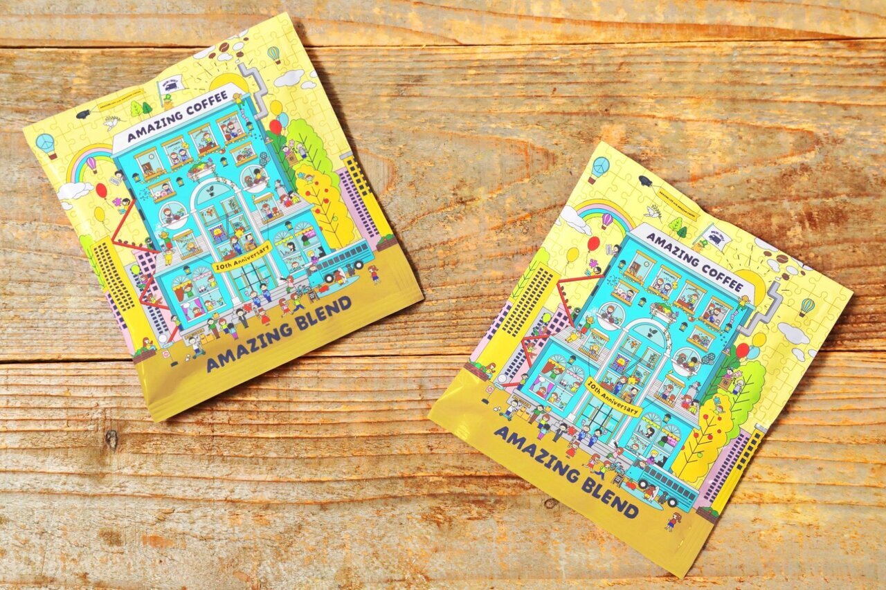 ご自宅やオフィス等でお湯を注ぐだけでお手軽に飲める、「AMAZING COFFEE」10周年記念デザインのドリップバッグです。