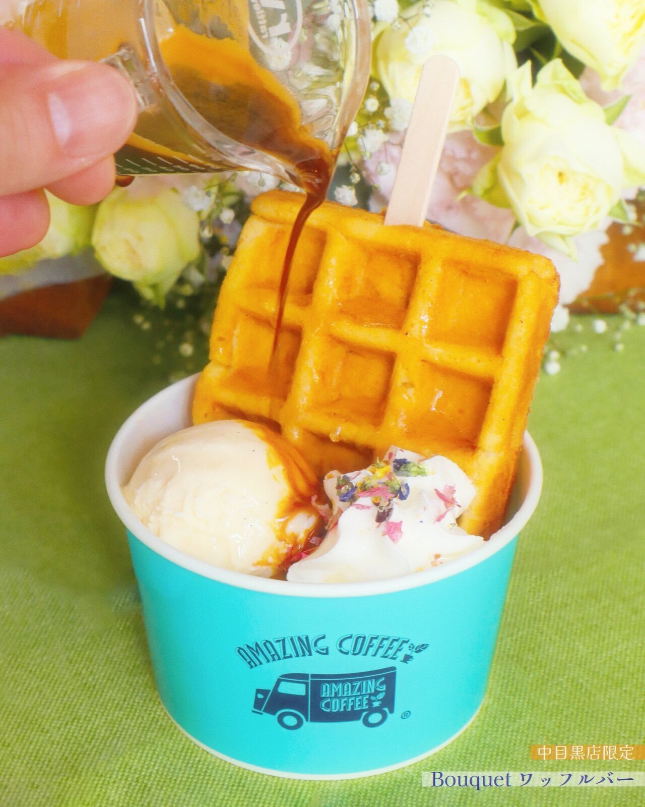 店内で焼き上げたワッフルバーに、バニラアイスとホイップクリームを添え、蘭の花のフレーバーを加えたオリジナルハニーソースをトッピングしました!!