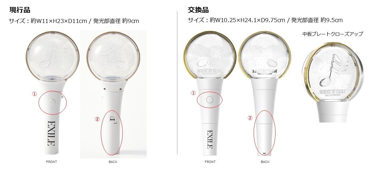 このたび、弊社製品「EXILE OFFICIAL LIGHT STICK 〜WHAT IS EXILE ver.〜」につきまして、製造上の仕様変更に伴い、該当商品をご購入いただいたお客様を対象に、無償での交換対応を実施させていただくこととなりました。