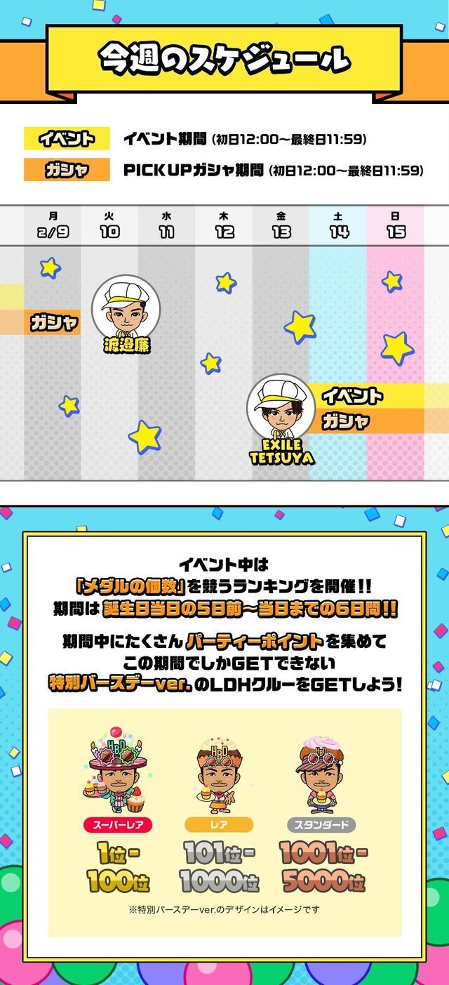 EXILE mobile マイページ 2026.02.09 NEW ★EXILE mobileマイページ★ MEMBER BIRTHDAY PARTY 今週のイベントラインナップ ※オリジナル画像は、メンバーのバースデー前日の12:00から当日の11:59までダウンロードすることができます。