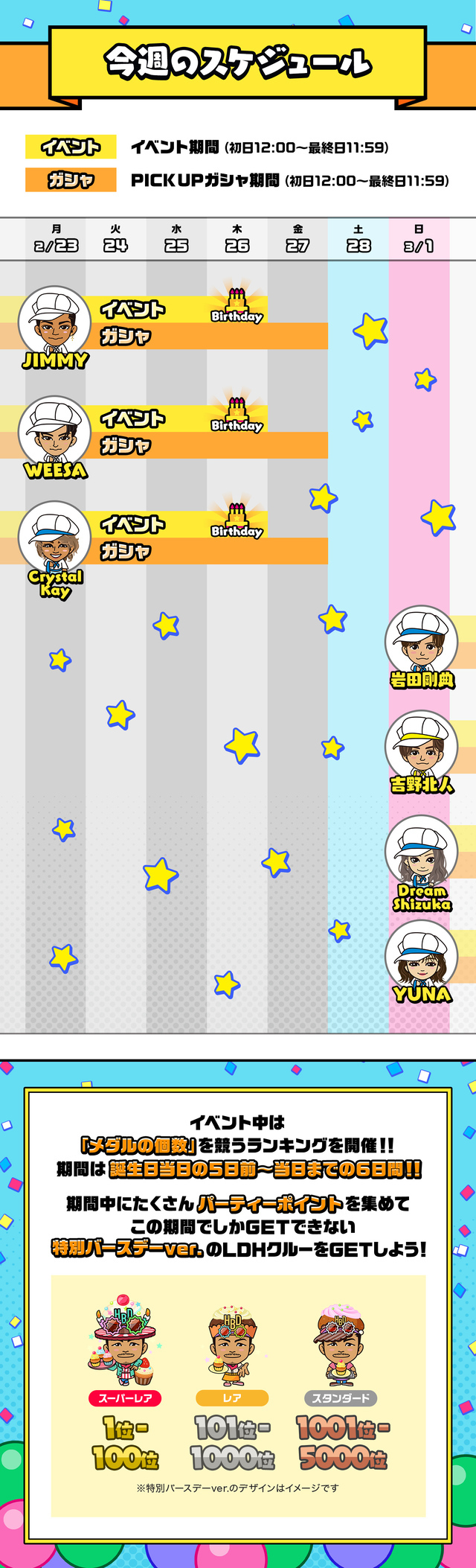 EXILE mobile マイページ 2026.02.23 NEW ★EXILE mobileマイページ★ MEMBER BIRTHDAY PARTY 今週のイベントラインナップ ※オリジナル画像は、メンバーのバースデー前日の12:00から当日の11:59までダウンロードすることができます。