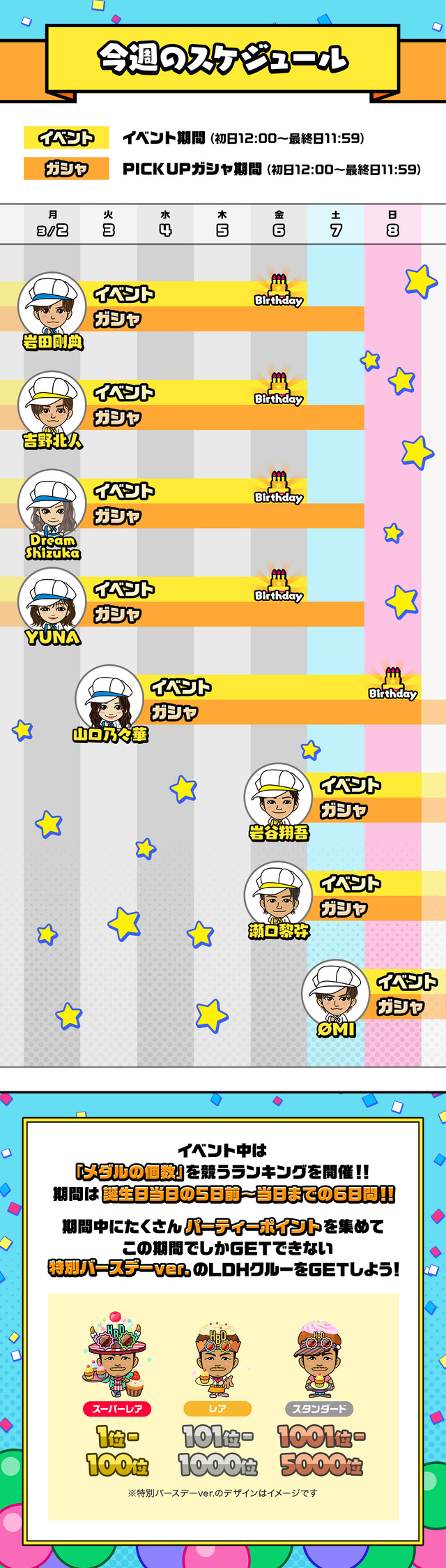 EXILE mobile マイページ 2026.03.02 NEW ★EXILE mobileマイページ★ MEMBER BIRTHDAY PARTY 今週のイベントラインナップ ※オリジナル画像は、メンバーのバースデー前日の12:00から当日の11:59までダウンロードすることができます。