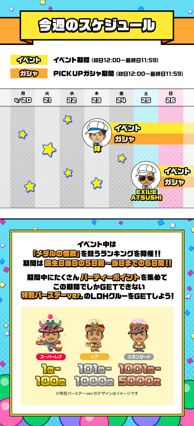 EXILE mobile マイページ 2026.04.20 NEW ★EXILE mobileマイページ★ MEMBER BIRTHDAY PARTY 今週のイベントラインナップ ※オリジナル画像は、メンバーのバースデー前日の12:00から当日の11:59までダウンロードすることができます。